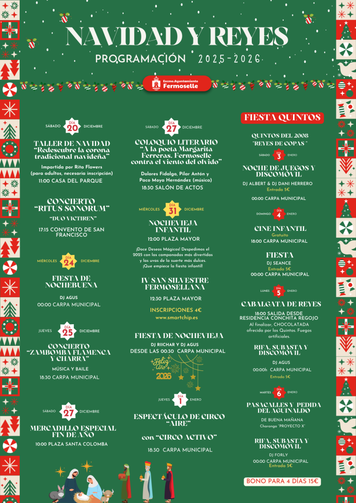 Fermoselle, diciembre de 2025. – Con la llegada de las fechas más entrañables del año, el Excmo. Ayuntamiento de Fermoselle presenta oficialmente su Programación de Navidad y Reyes 2025-2026. Una agenda diseñada para todas las edades que busca fomentar la convivencia y mantener vivas nuestras tradiciones más queridas.